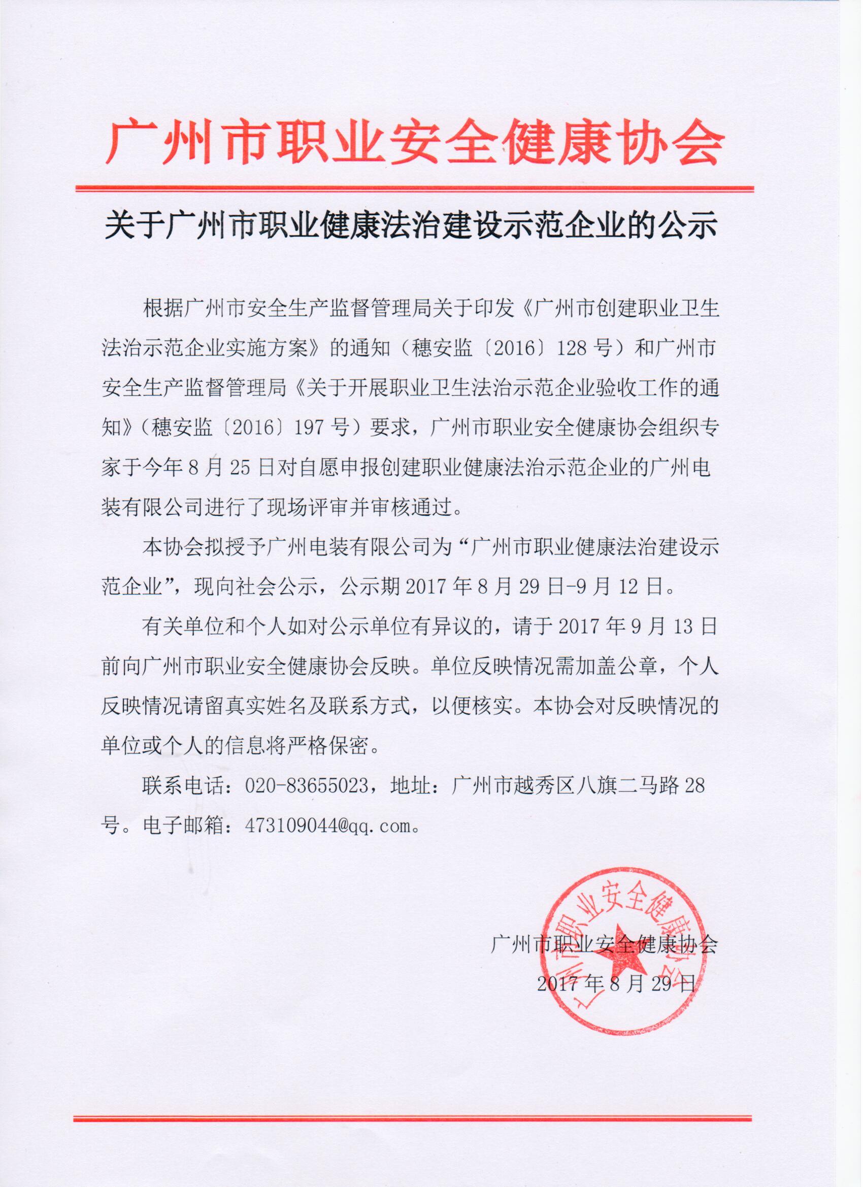 关于广州市职业健康法治建设示范企业的公示