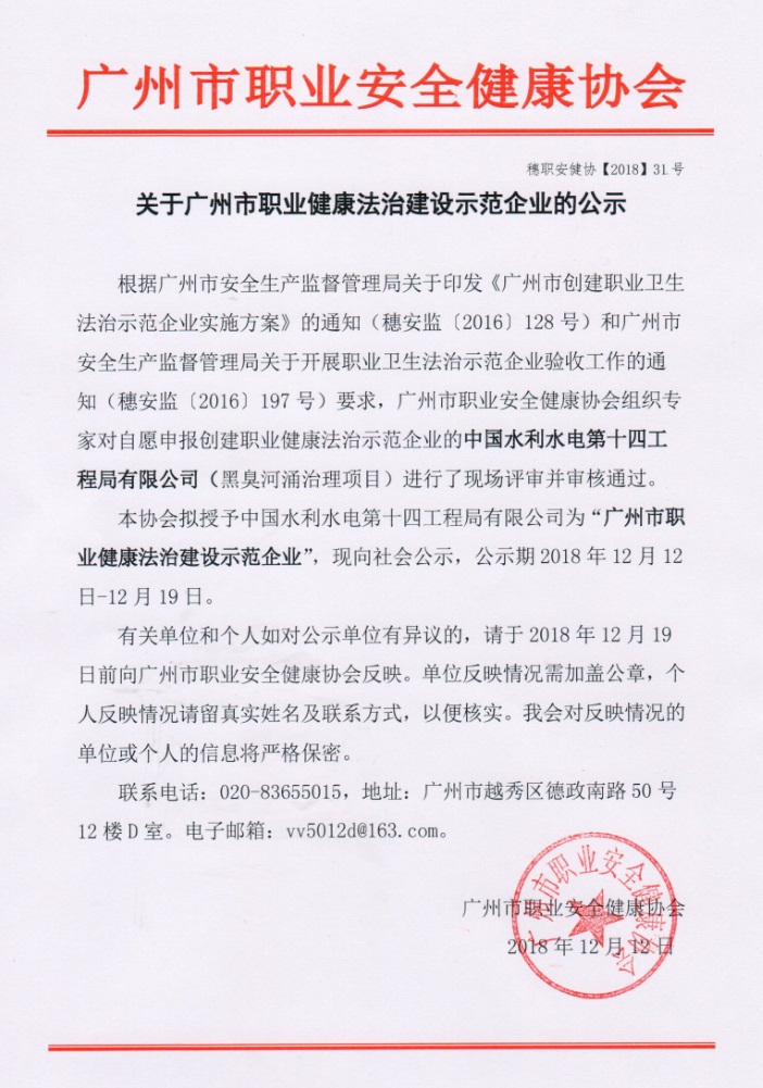 关于授予“广州市职业健康法治建设示范企业”称号的通知